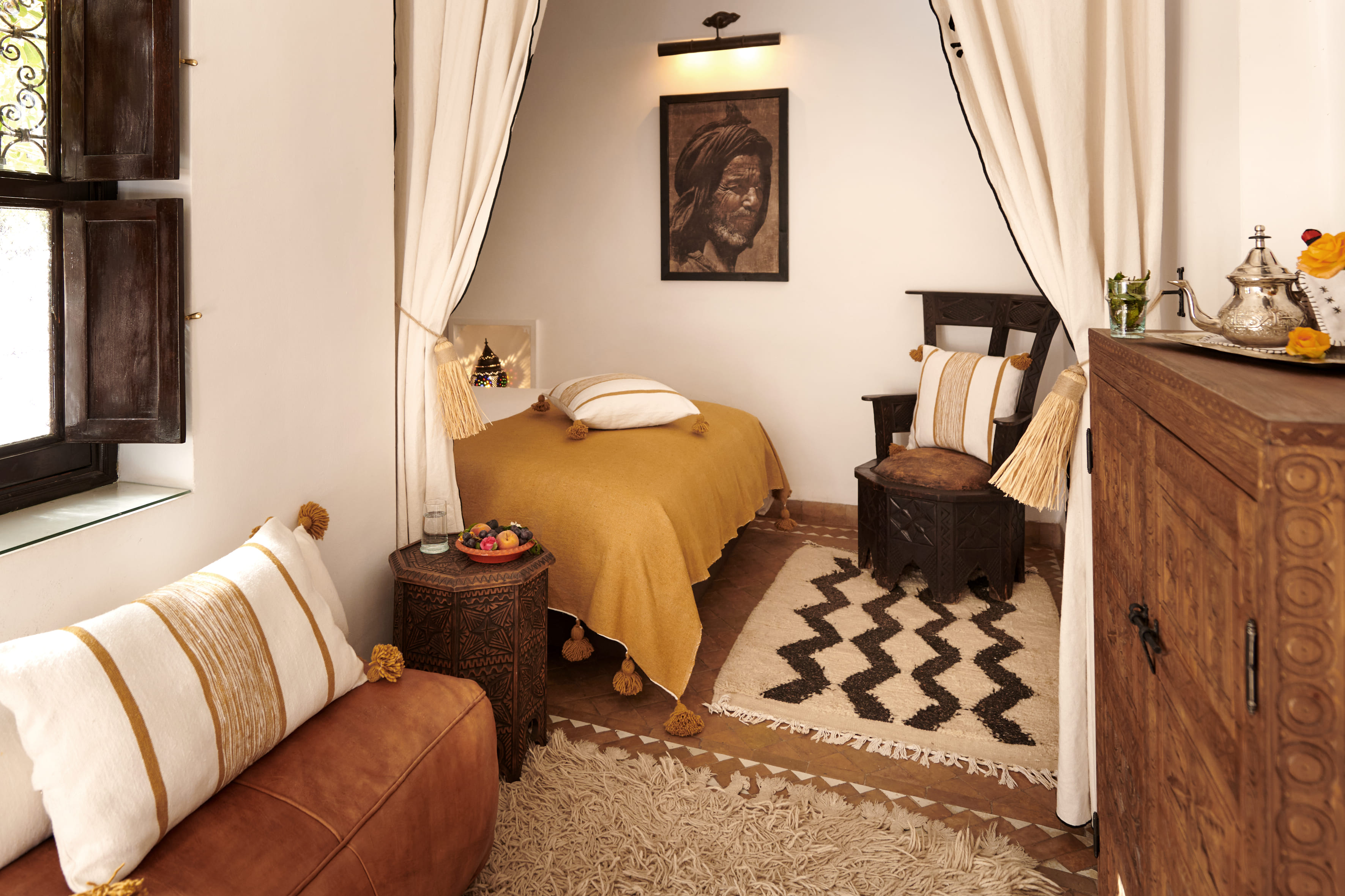 L’histoire de Dar Amanza débute avec un coup de foudre envers une bâtisse enracinée dans le quartier ancien de Bab Doukkala, au cœur de la médina de Marrakech. Une maison de famille qui deviendra, deux décennies plus tard, un riad haut de gamme, une villa de standing. Un Eden verdoyant qui émerge au beau milieu du souk marrackchi. Son jardin luxuriant – ô privilège ! – est accessible depuis la maison via une coursive secrète. Y règnent cocotiers, washingtonias, arbres fruitiers et autres plantes grimpantes. On y profite du calme à l’abri d’une pergola, près du bassin ou allongé dans un hamac. Ce calme, bien que surprenant et apaisant, laisse passer quelques bribes du quotidien foisonnant de Bab Doukkala. Trois chambres et une suite offrent aux voyageurs de véritables refuges. Y flotte un parfum mêlant fragrances marocaines et senteurs corses. Objets chinés et nuances ocrées y témoignent de la richesse du Maroc. On s’y sent chez soi mais… ailleurs.